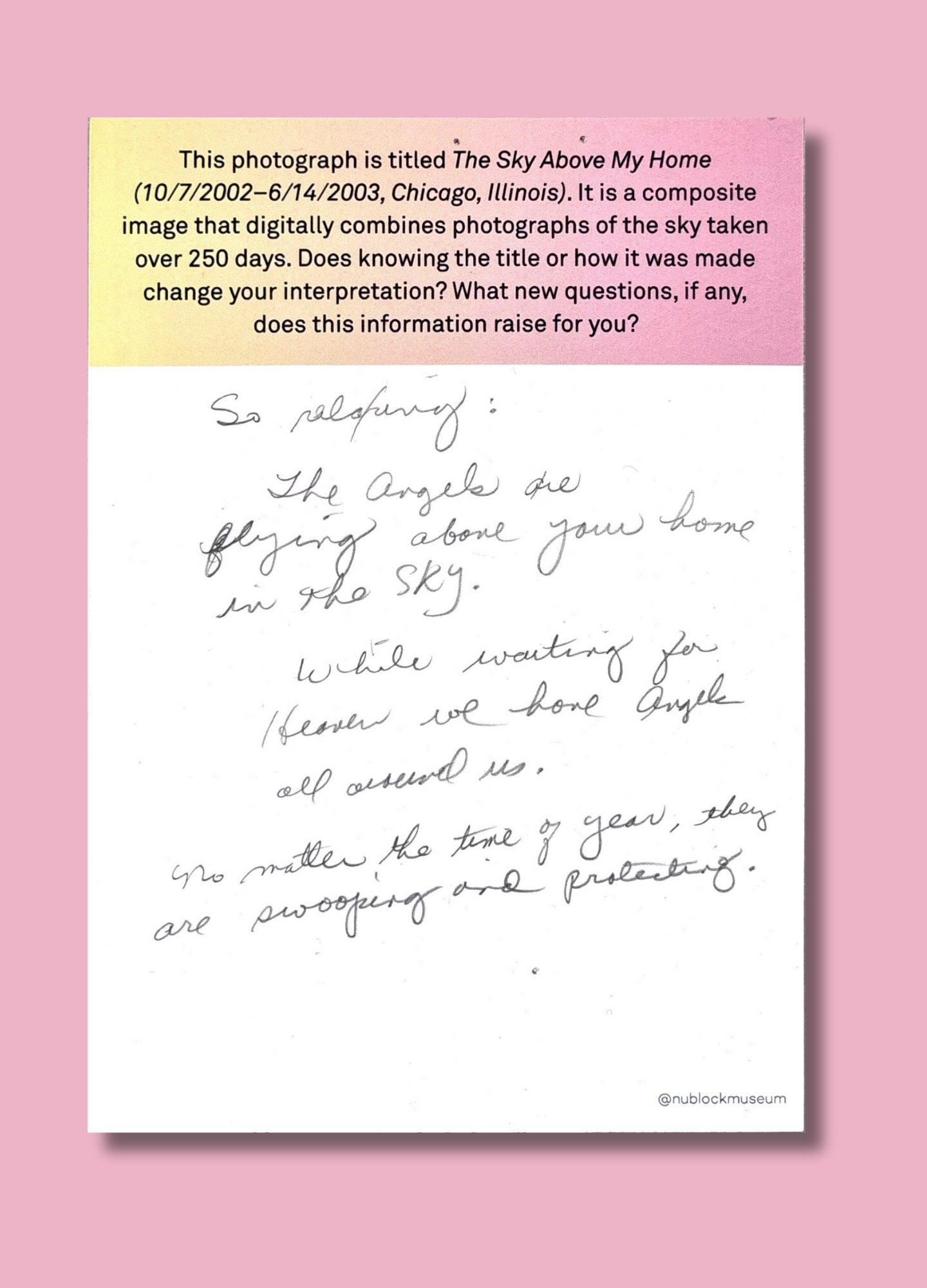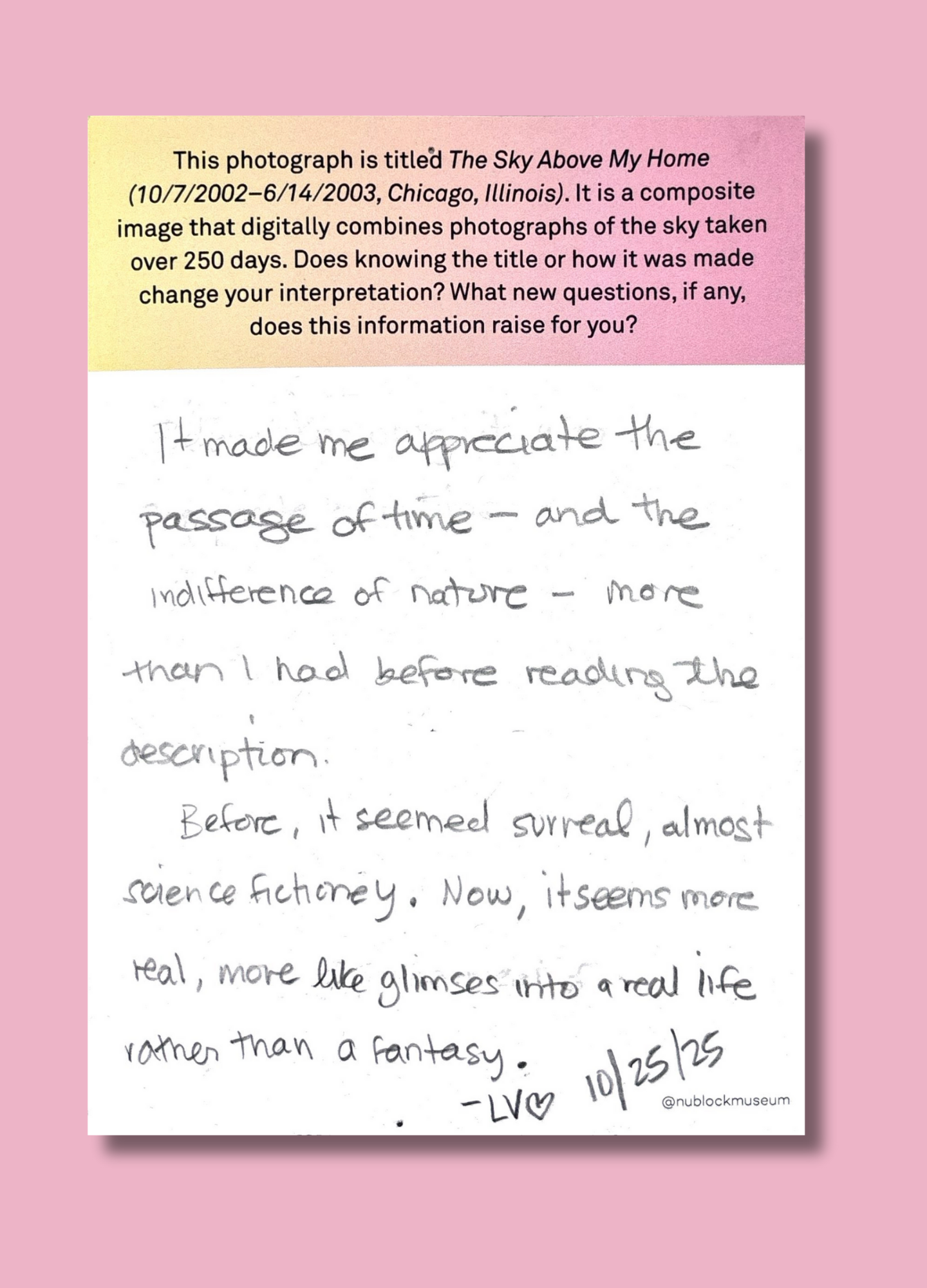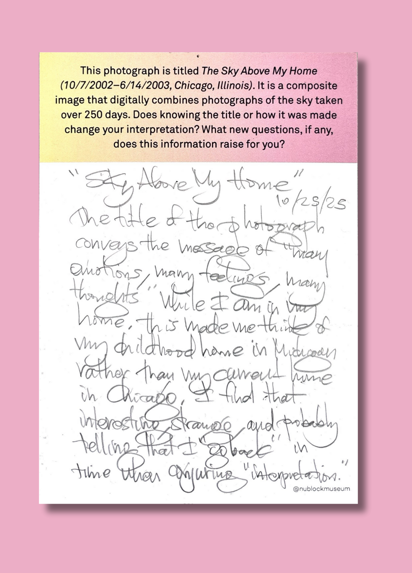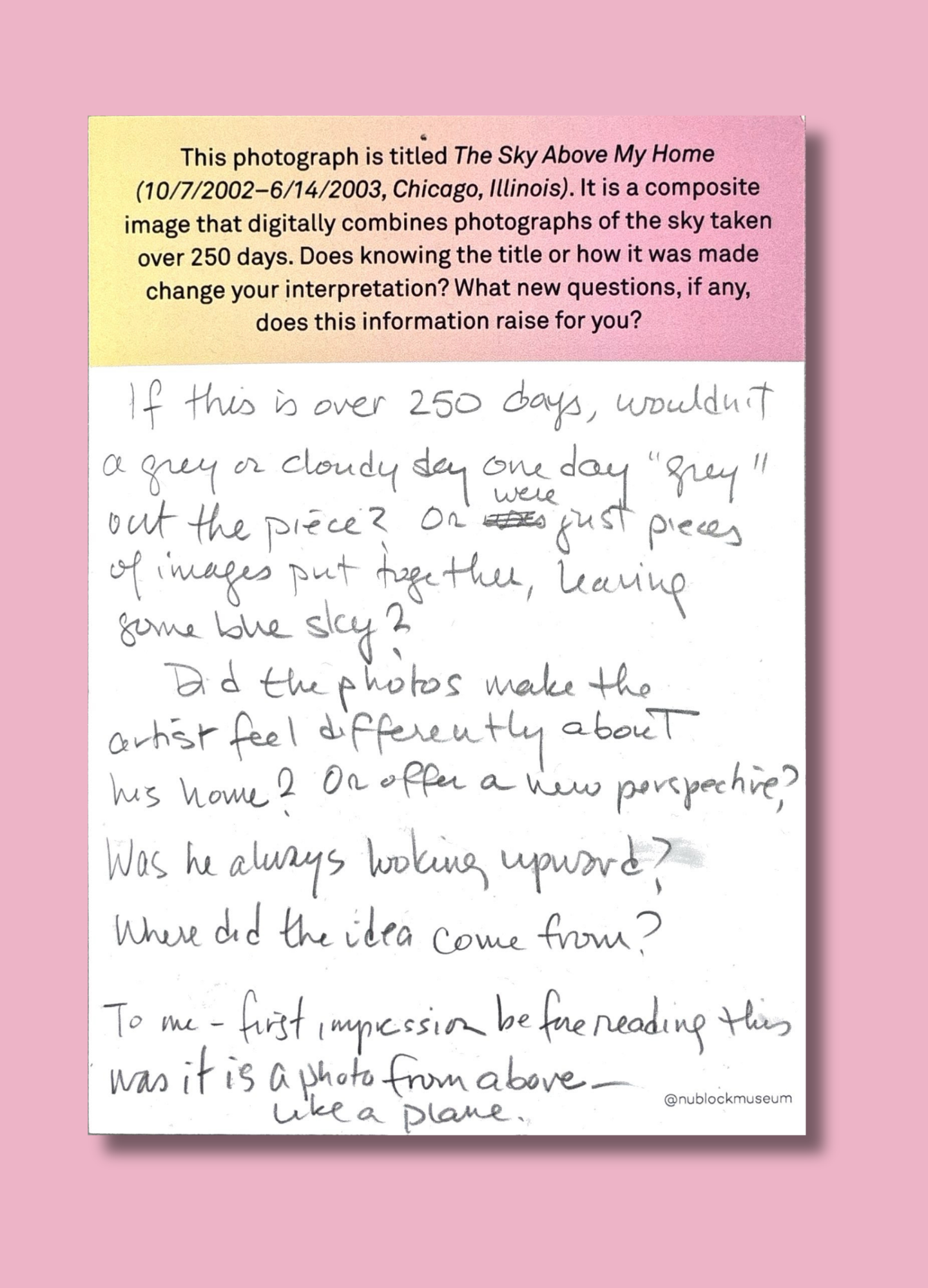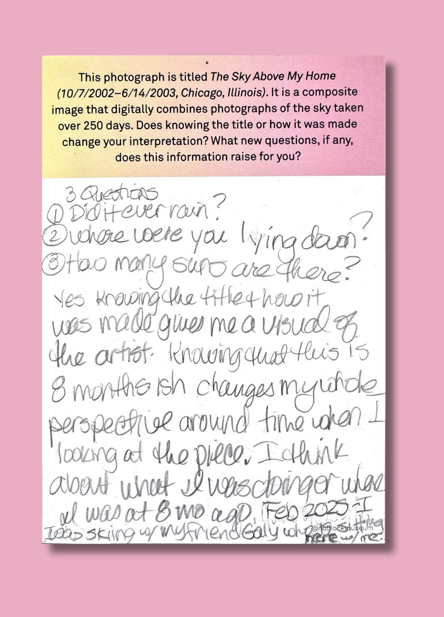 On this page, we’ve gathered a selection of those reflections collected during the presentation of Ken Fandell's “The Sky Above My Home (10/7/2002–6/14/2003, Chicago, Illinois)” Together, they capture the many ways our community engages with art and show how thoughtful looking can open up new ideas, questions, and perspectives.