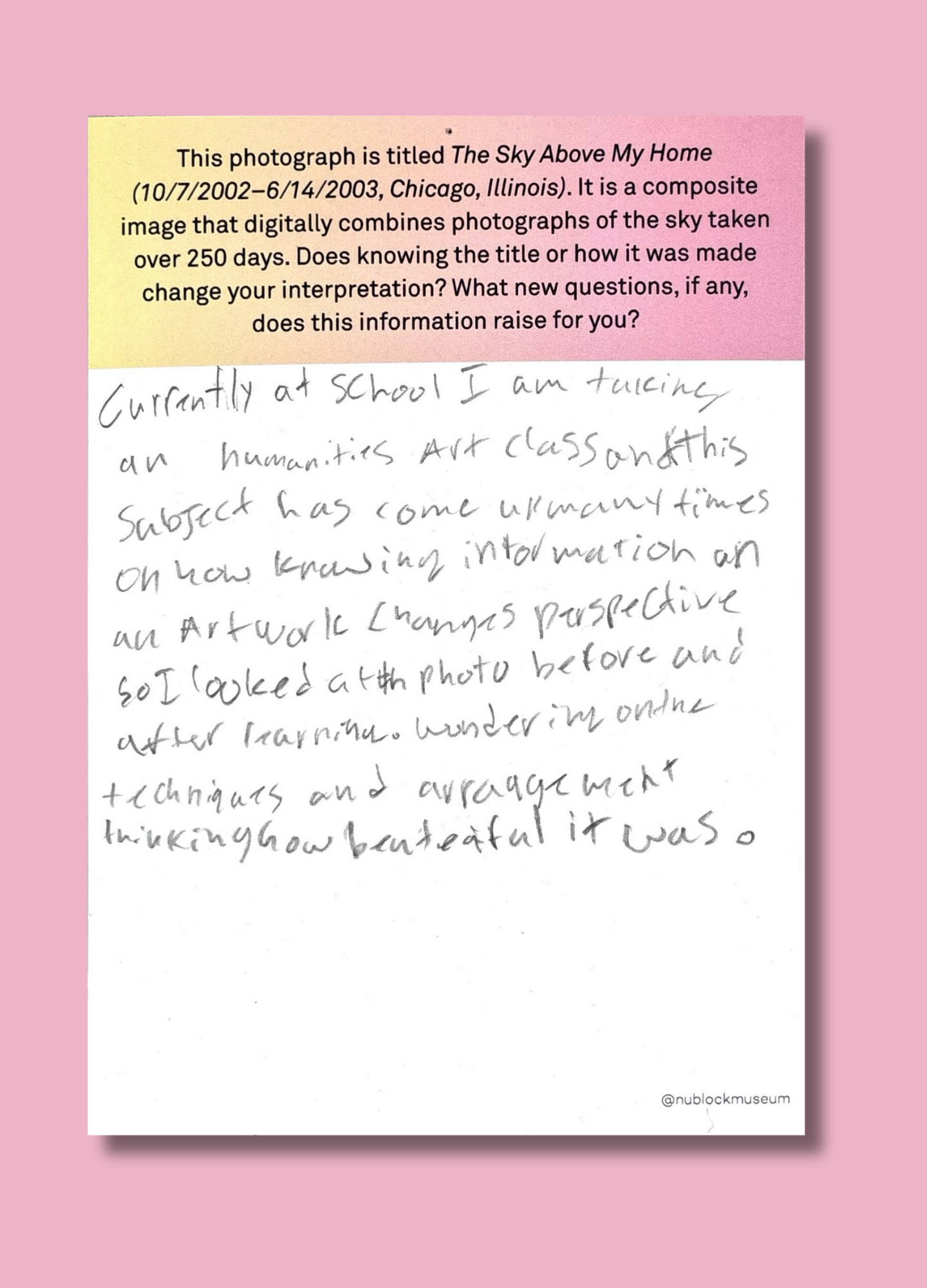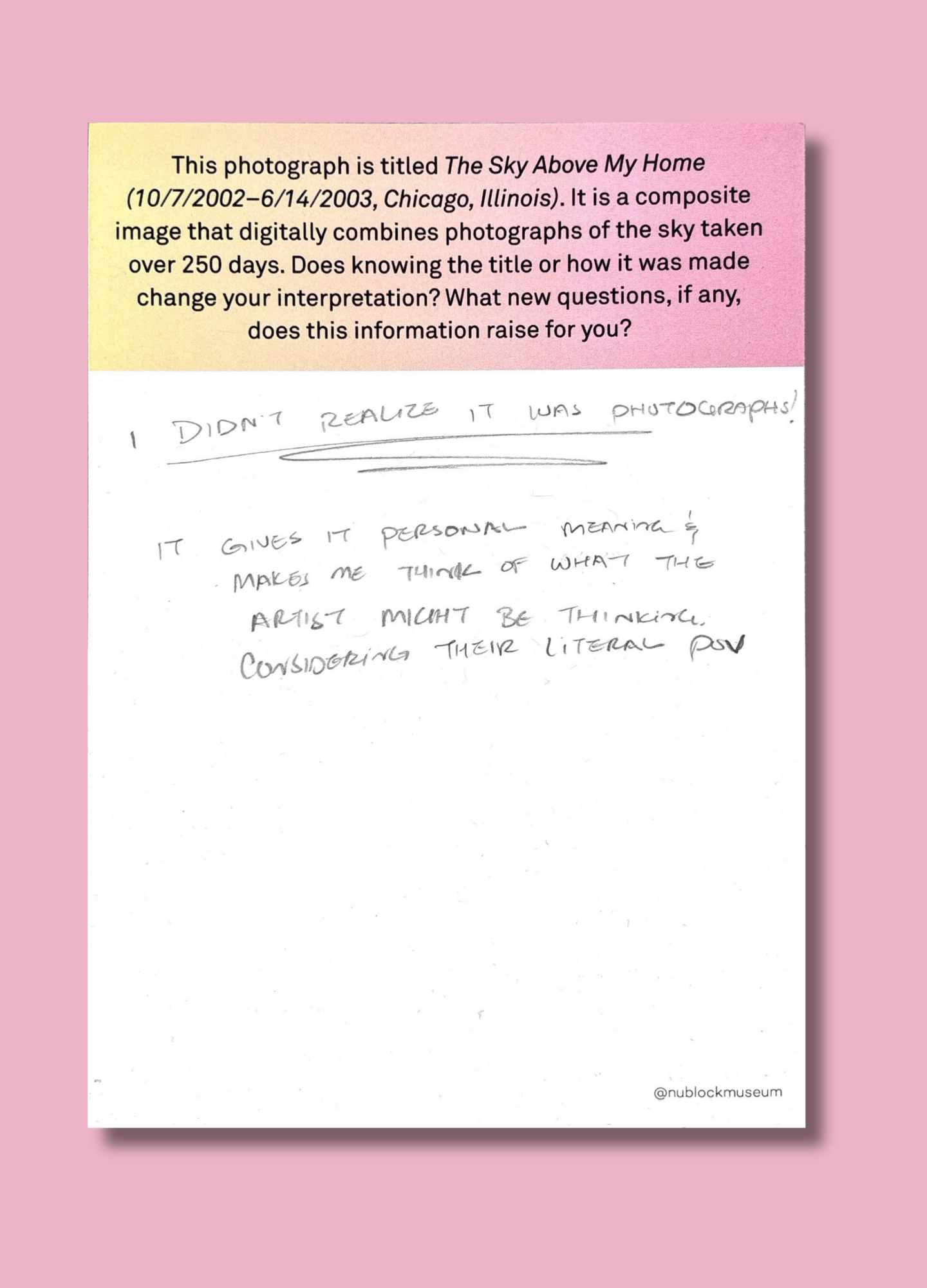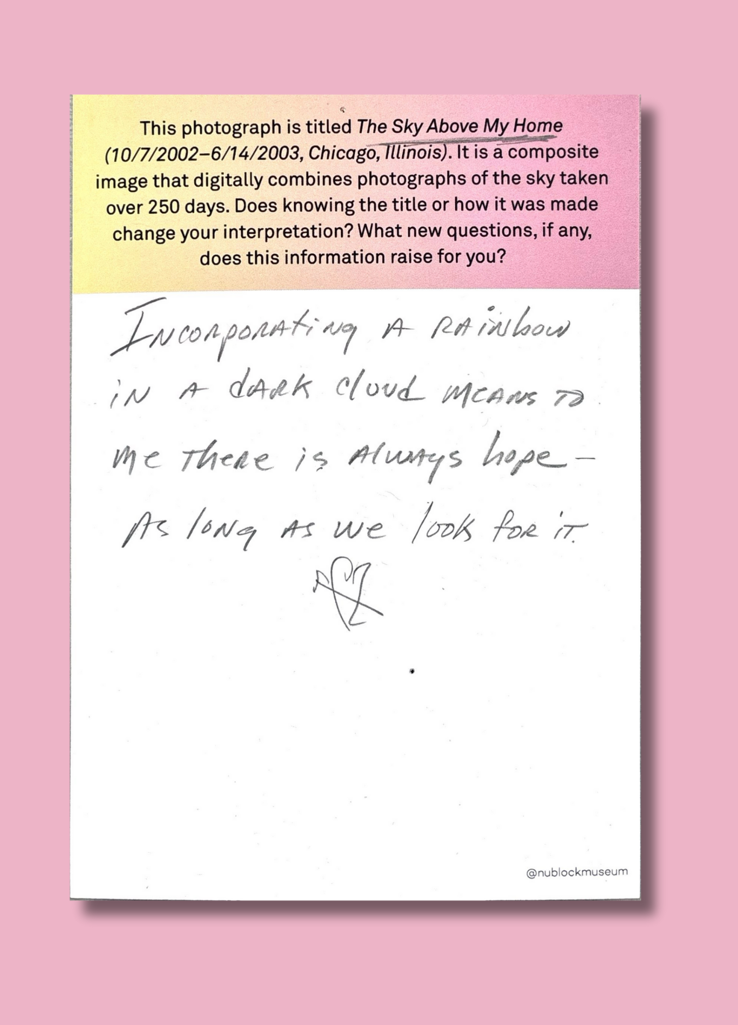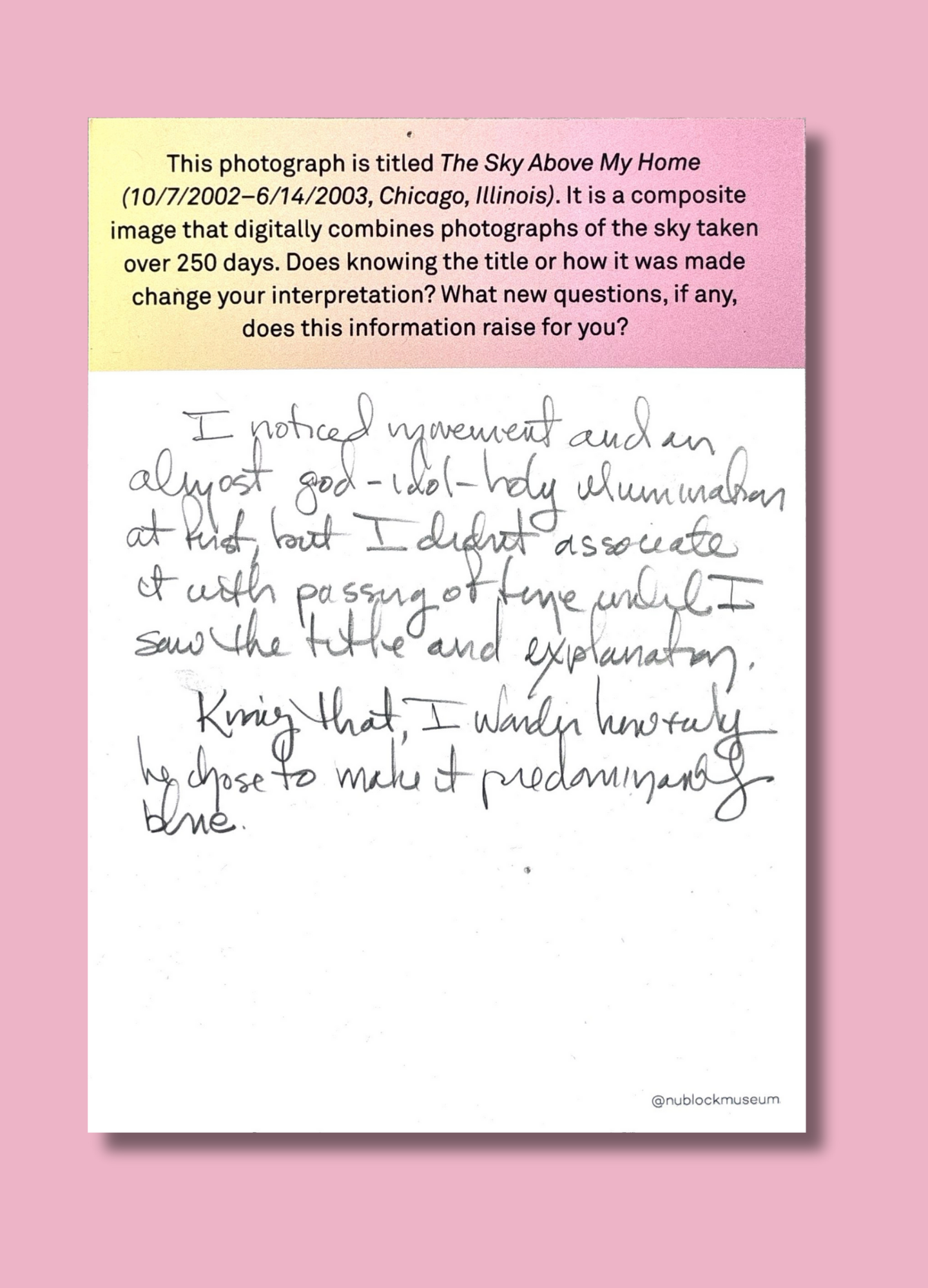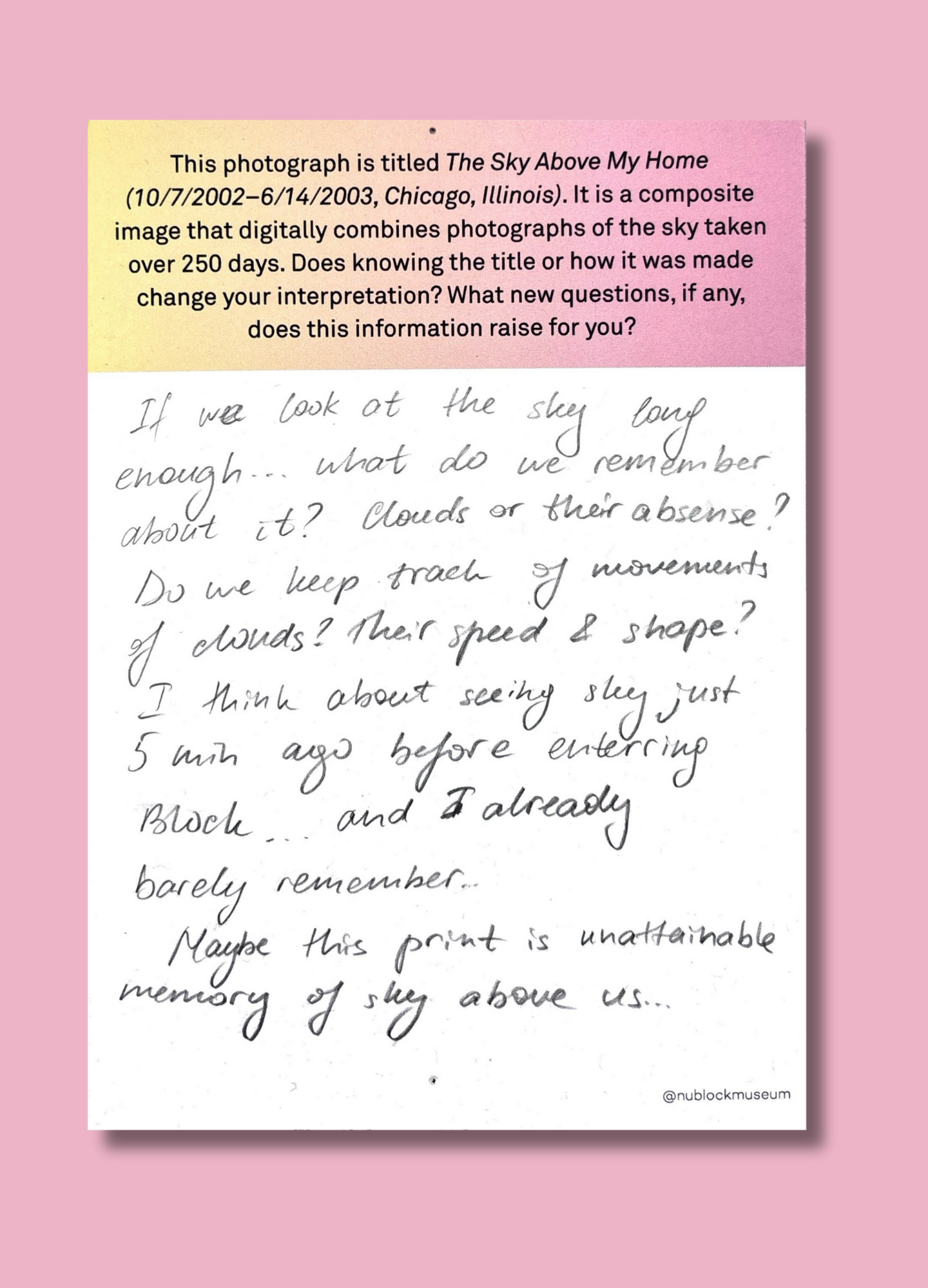 On this page, we’ve gathered a selection of those reflections collected during the presentation of Ken Fandell's “The Sky Above My Home (10/7/2002–6/14/2003, Chicago, Illinois)” Together, they capture the many ways our community engages with art and show how thoughtful looking can open up new ideas, questions, and perspectives.