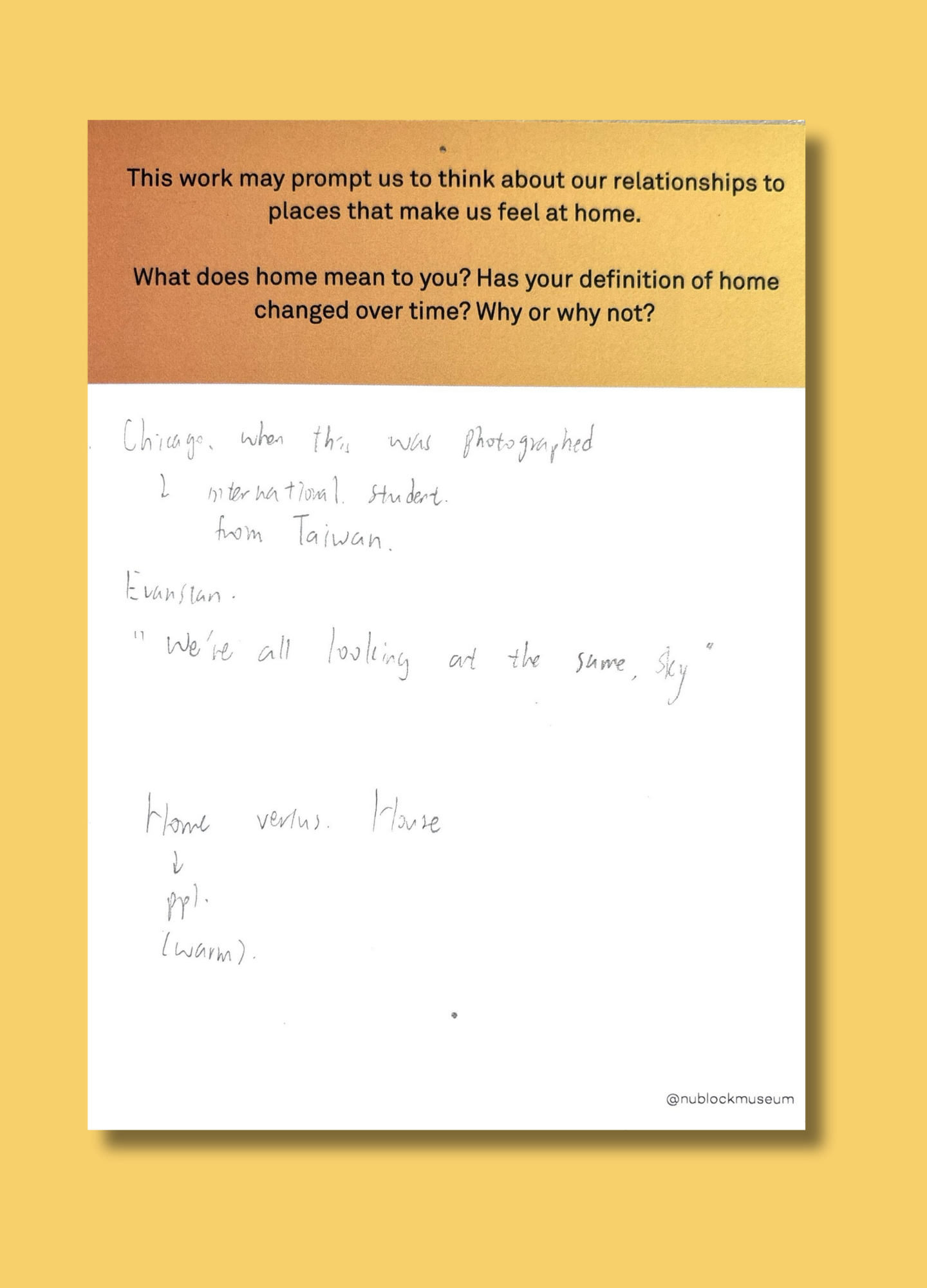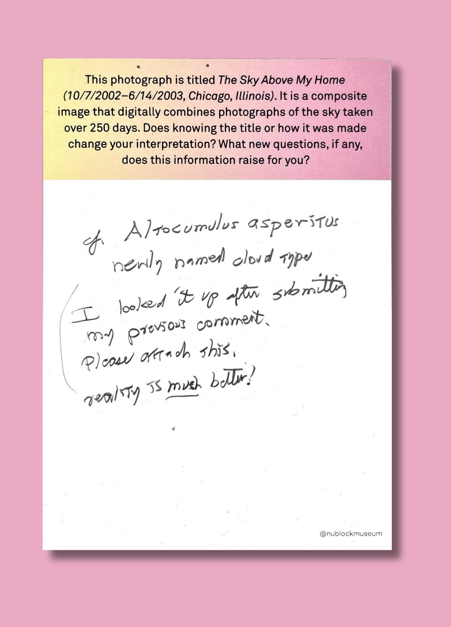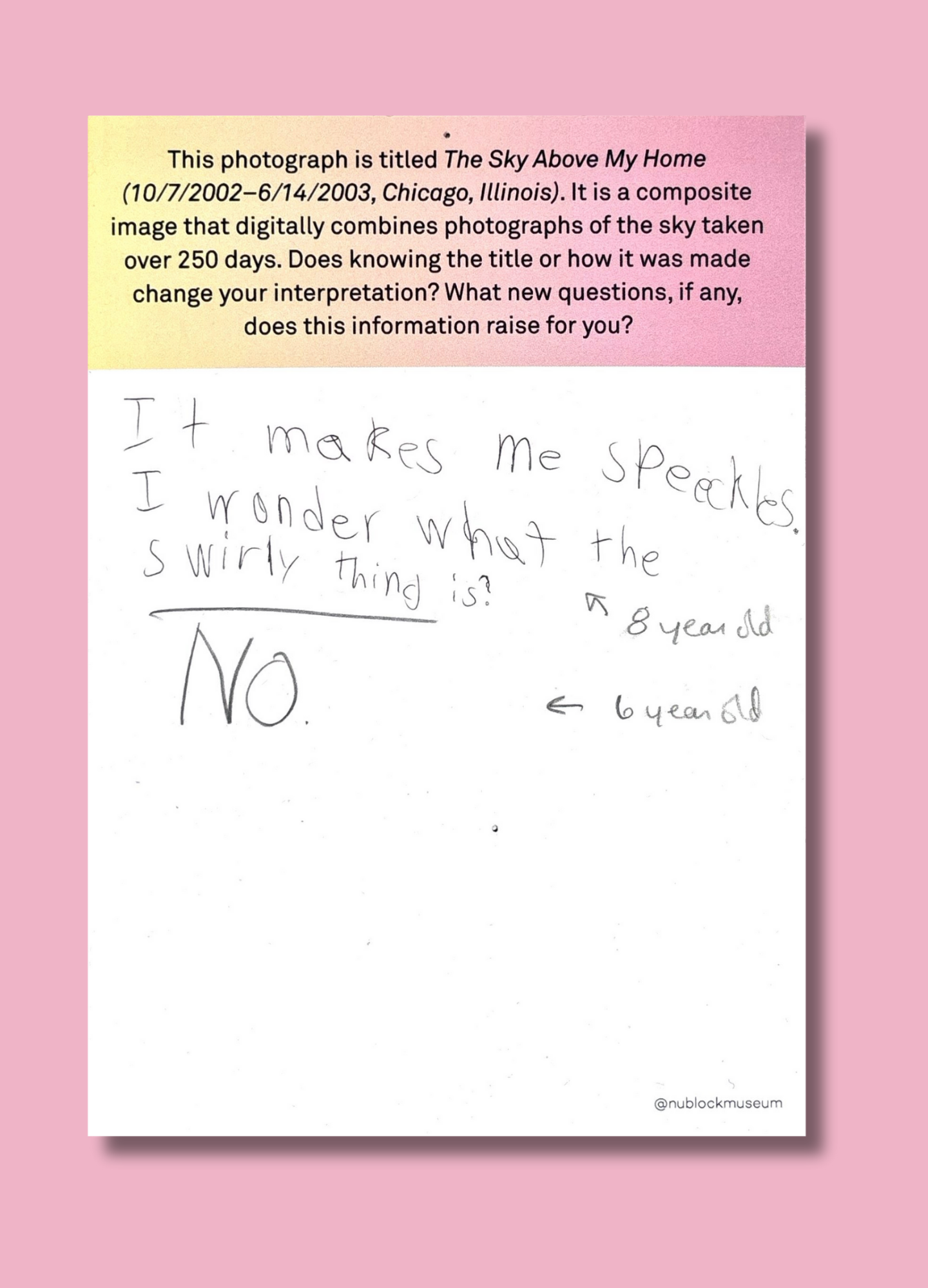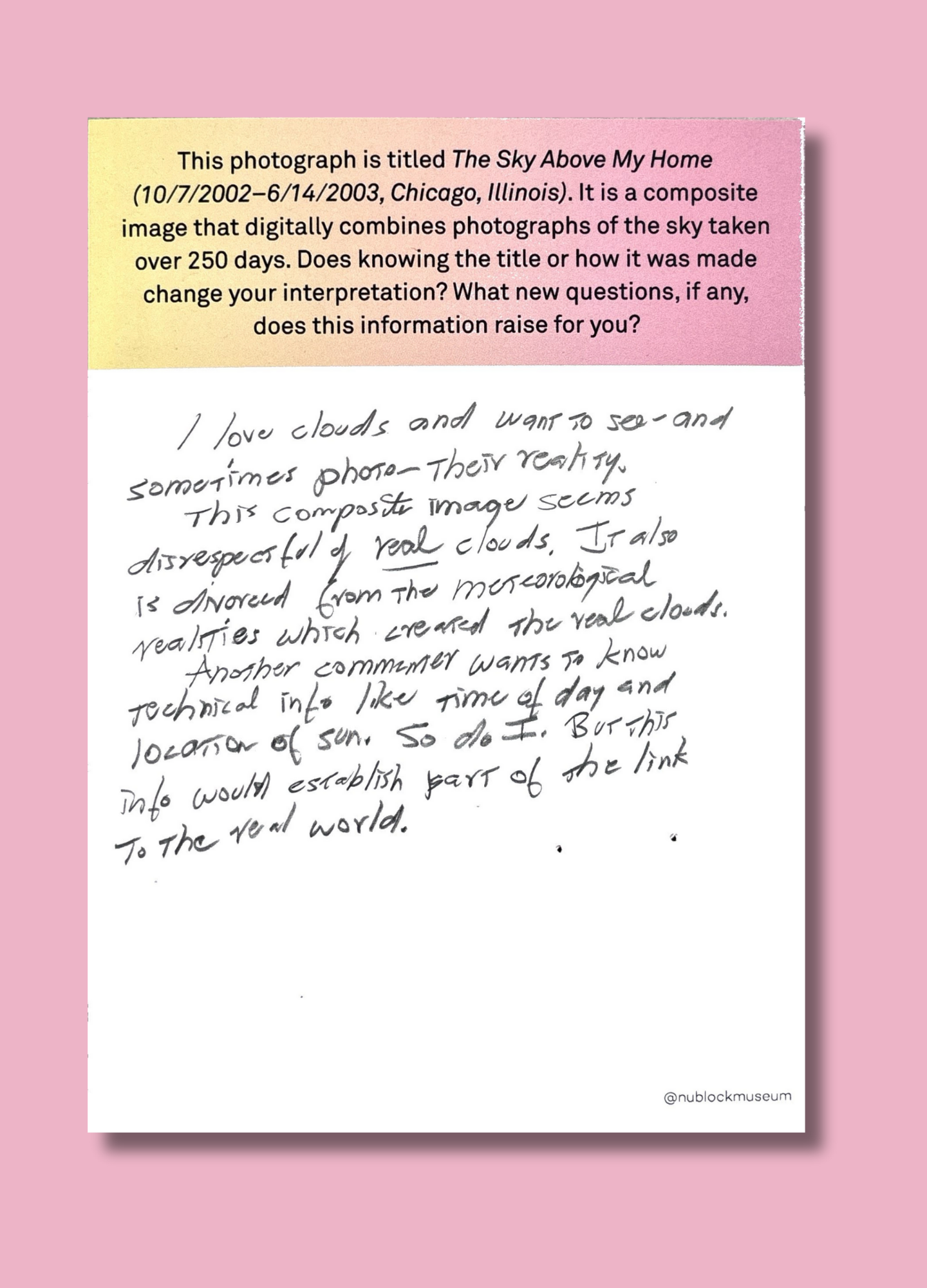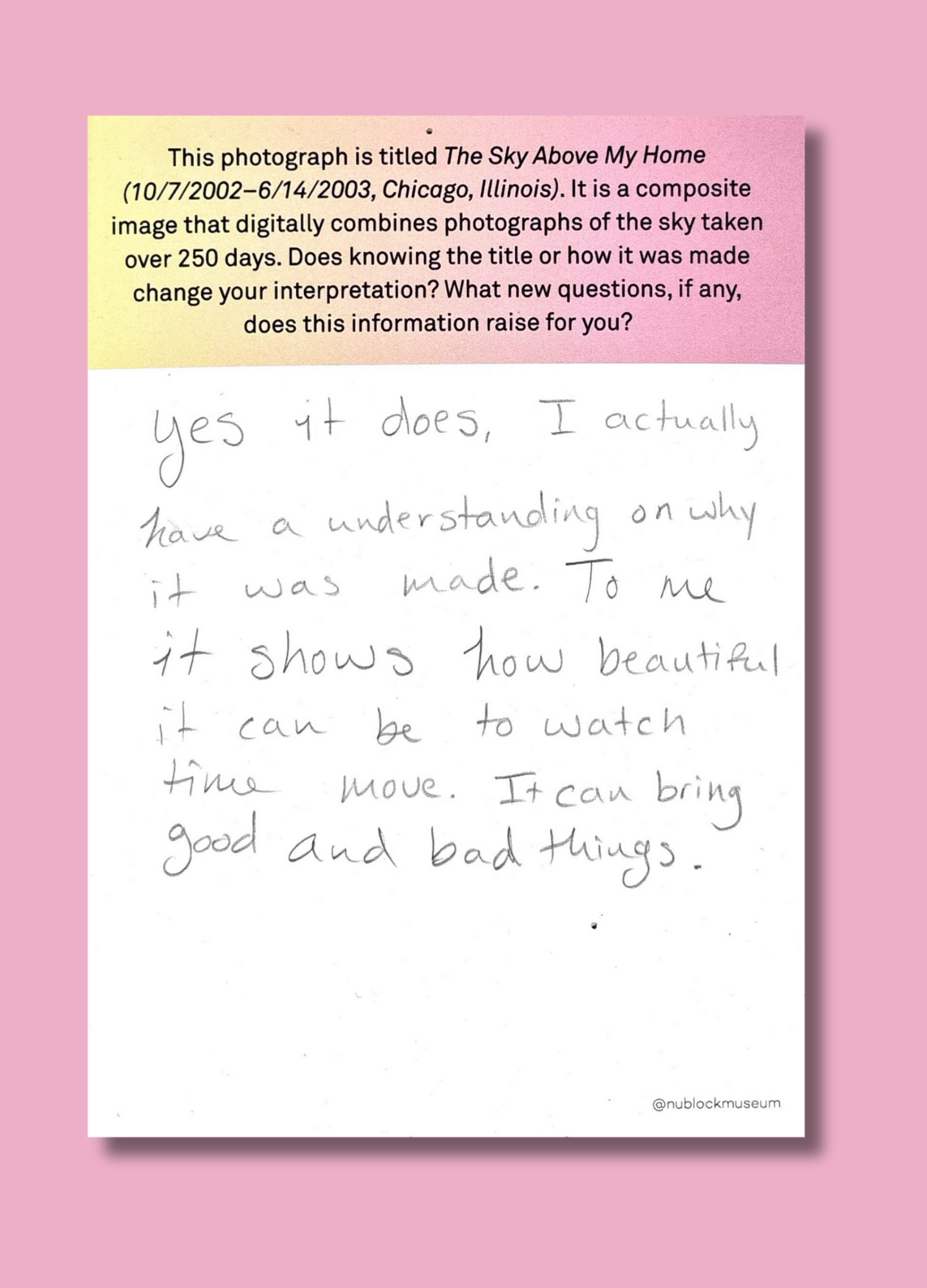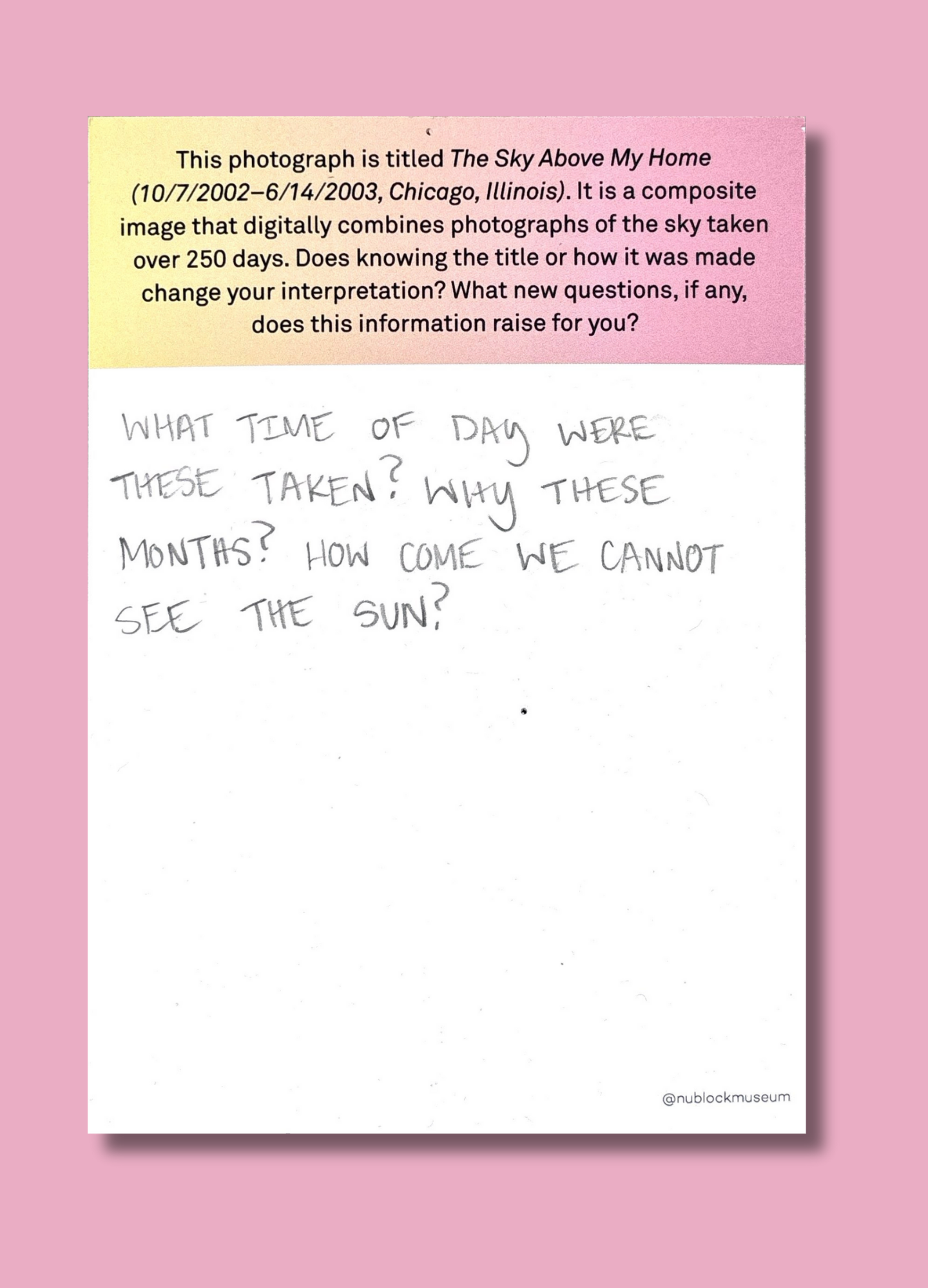 On this page, we’ve gathered a selection of those reflections collected during the presentation of Ken Fandell's “The Sky Above My Home (10/7/2002–6/14/2003, Chicago, Illinois)” Together, they capture the many ways our community engages with art and show how thoughtful looking can open up new ideas, questions, and perspectives.