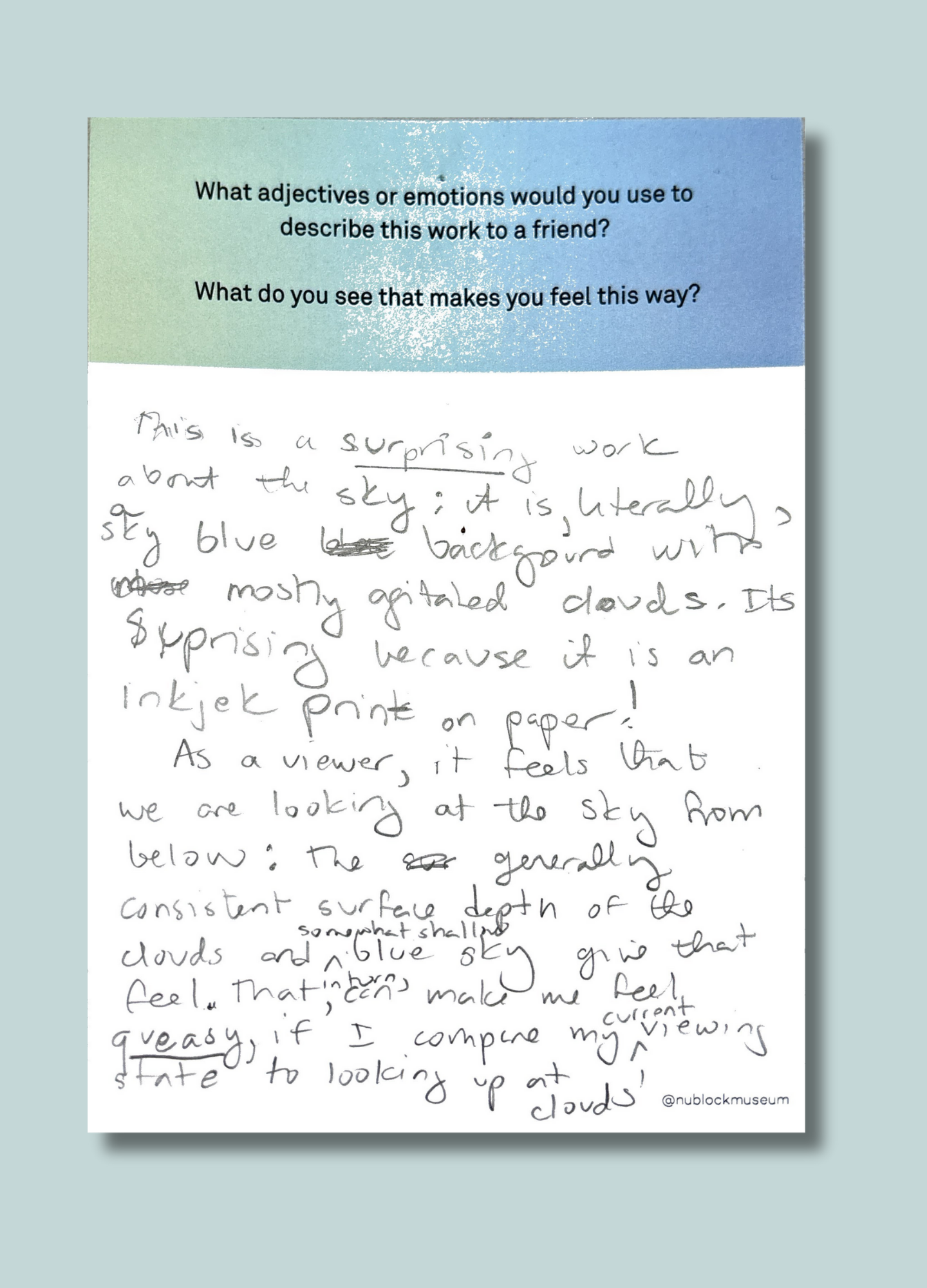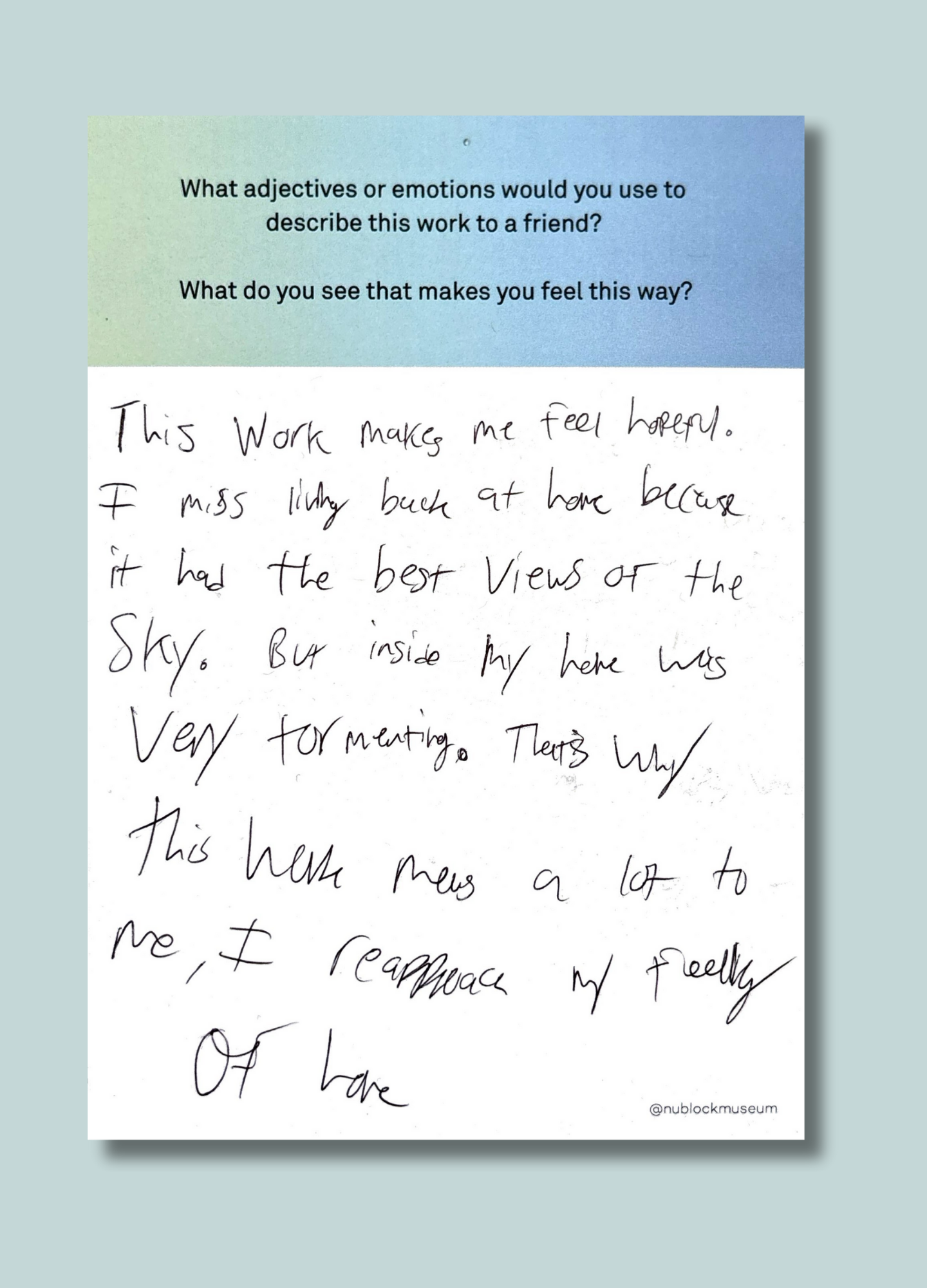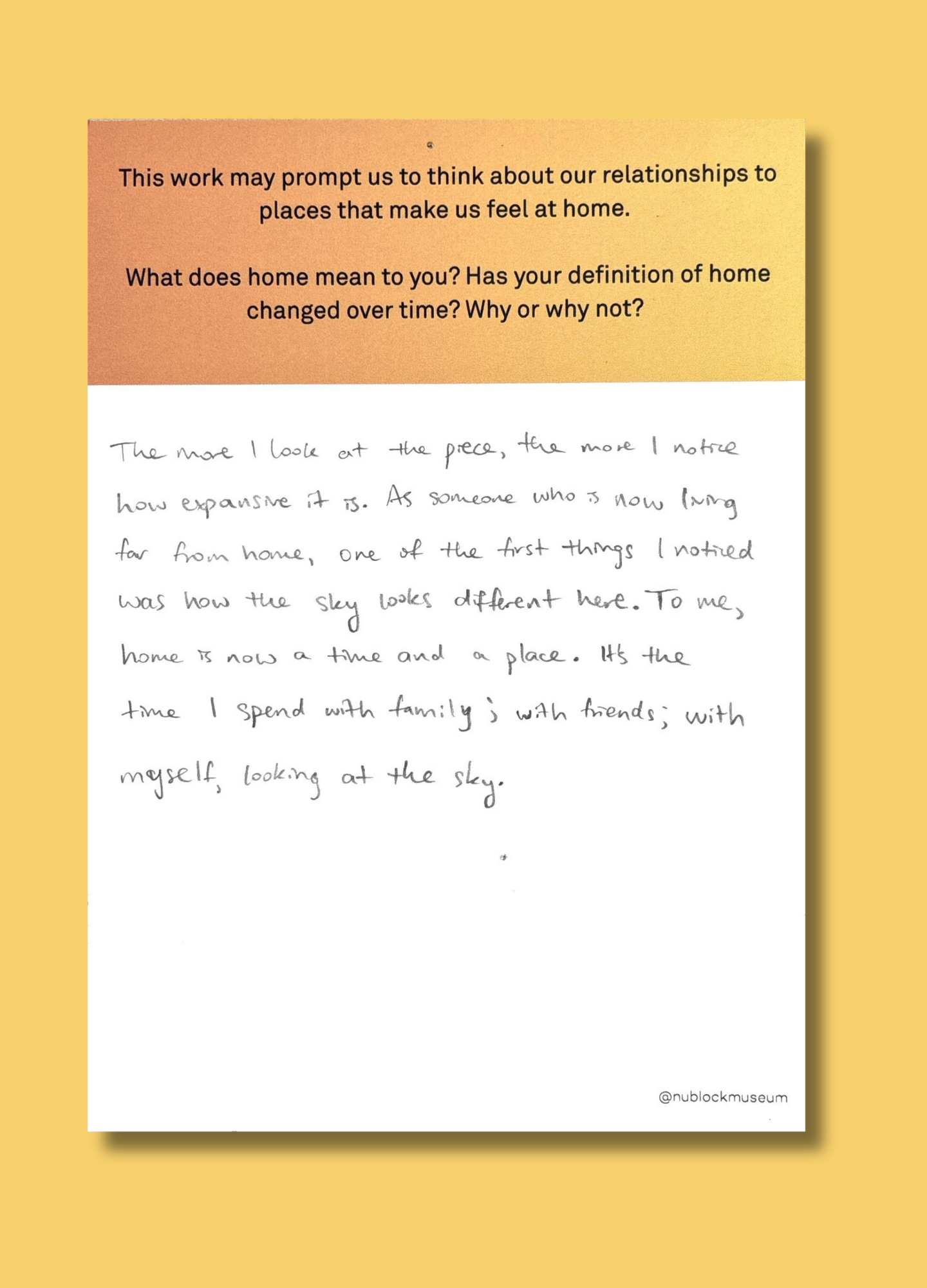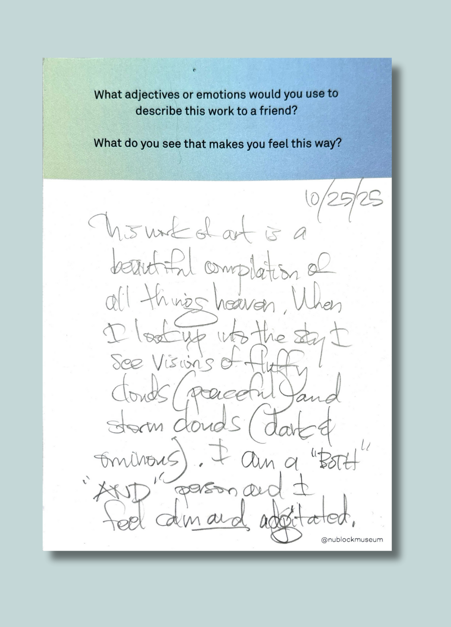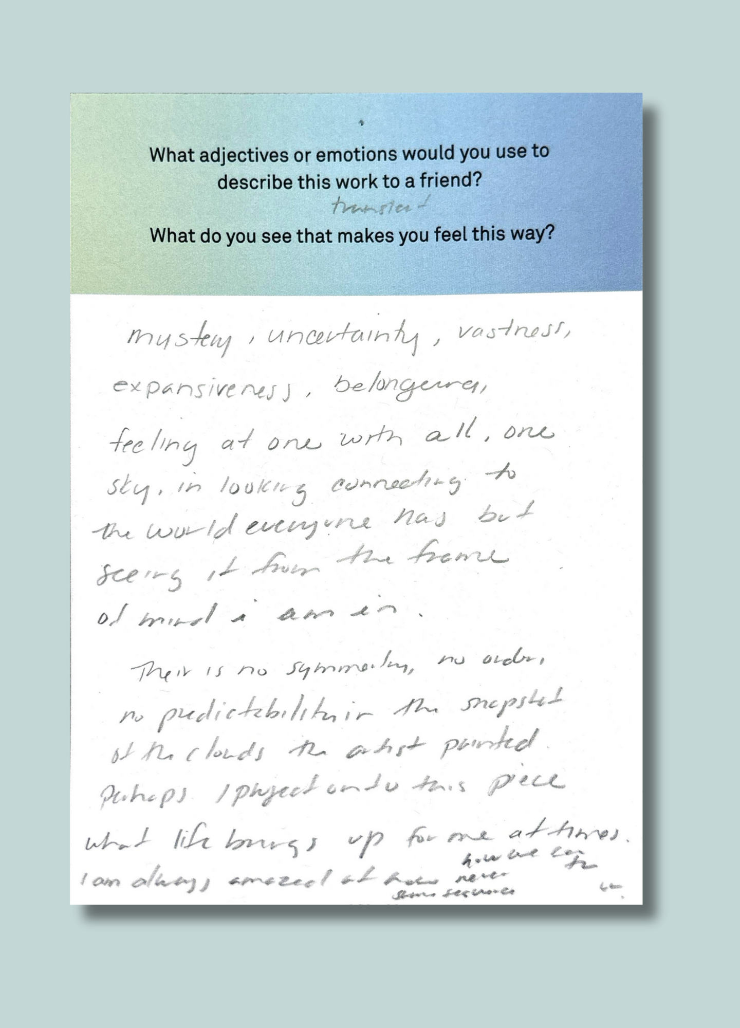 On this page, we’ve gathered a selection of those reflections collected during the presentation of Ken Fandell's “The Sky Above My Home (10/7/2002–6/14/2003, Chicago, Illinois)” Together, they capture the many ways our community engages with art and show how thoughtful looking can open up new ideas, questions, and perspectives.