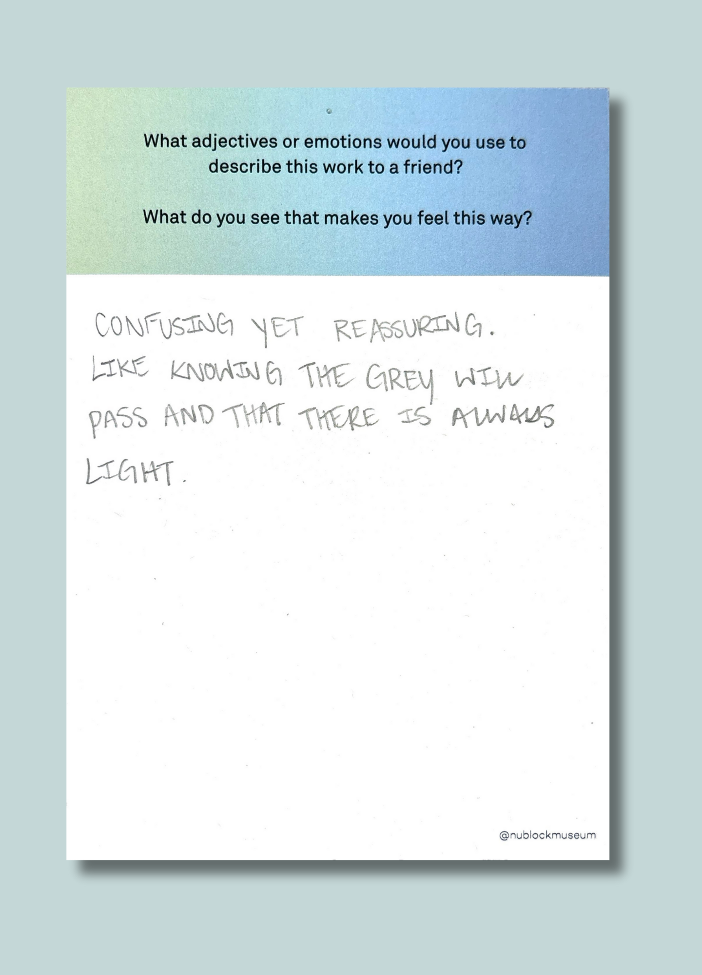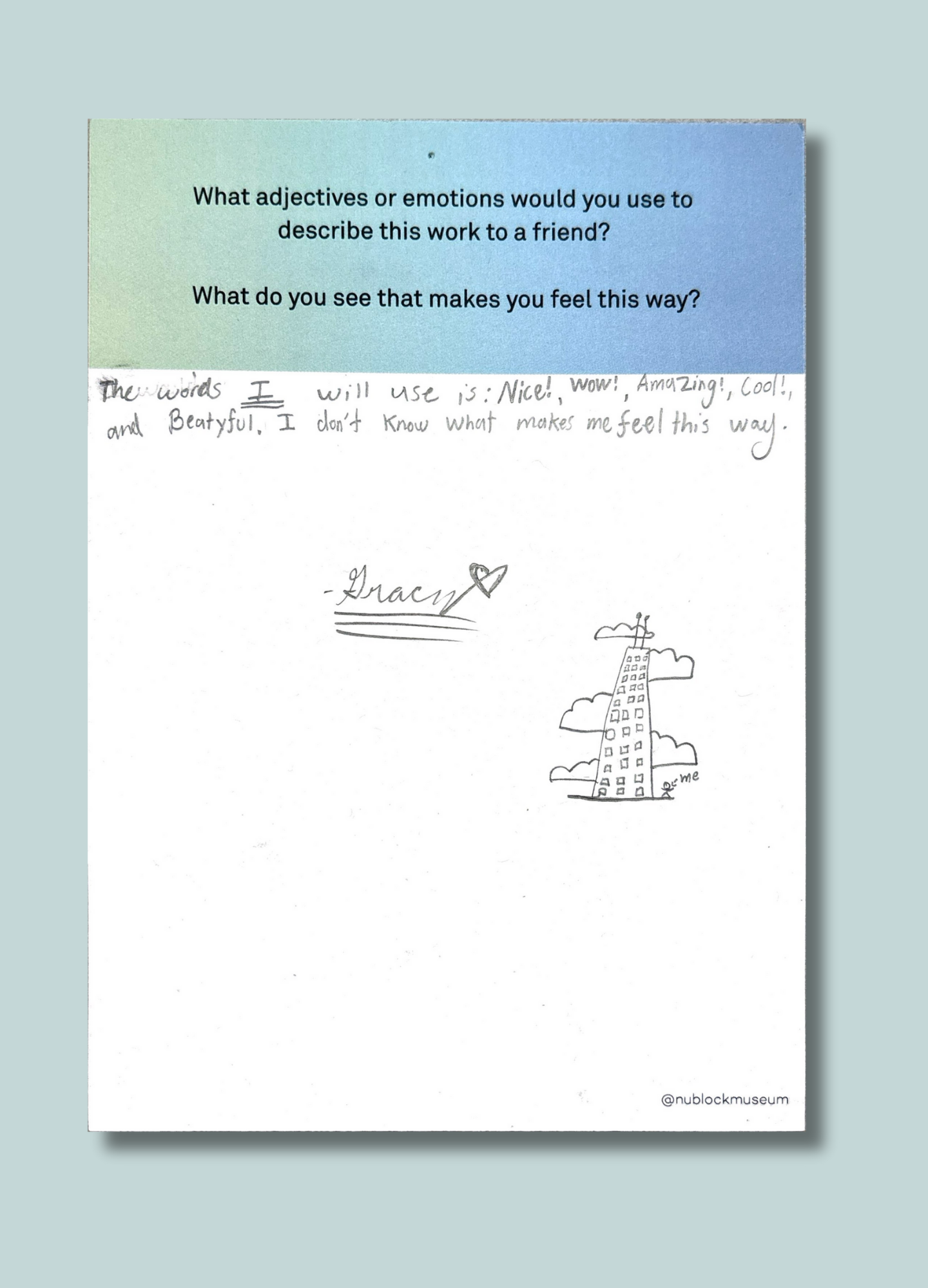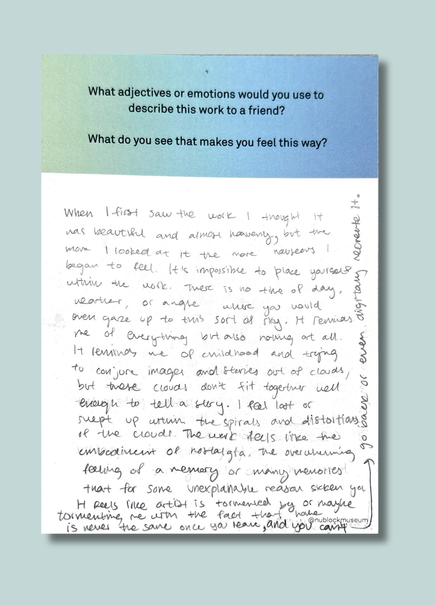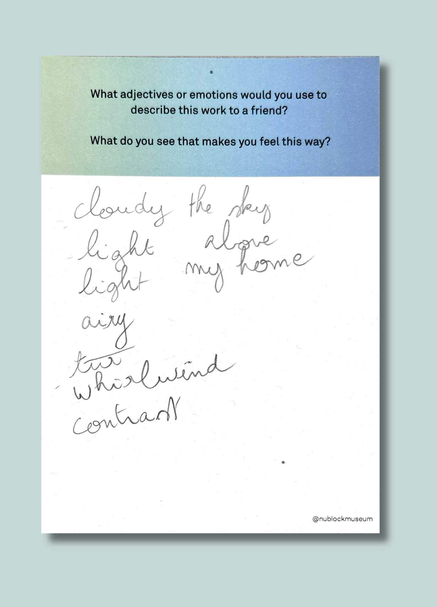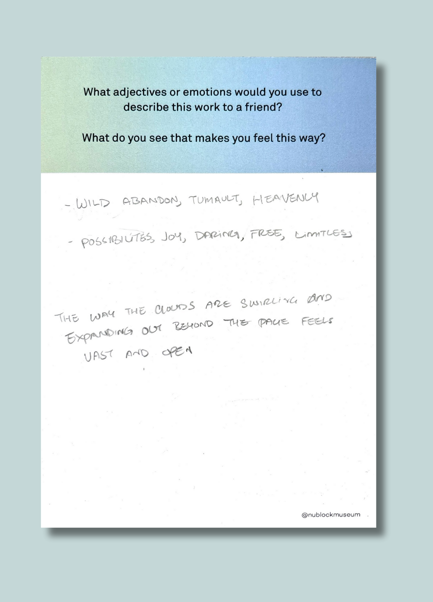 On this page, we’ve gathered a selection of those reflections collected during the presentation of Ken Fandell's “The Sky Above My Home (10/7/2002–6/14/2003, Chicago, Illinois)” Together, they capture the many ways our community engages with art and show how thoughtful looking can open up new ideas, questions, and perspectives.