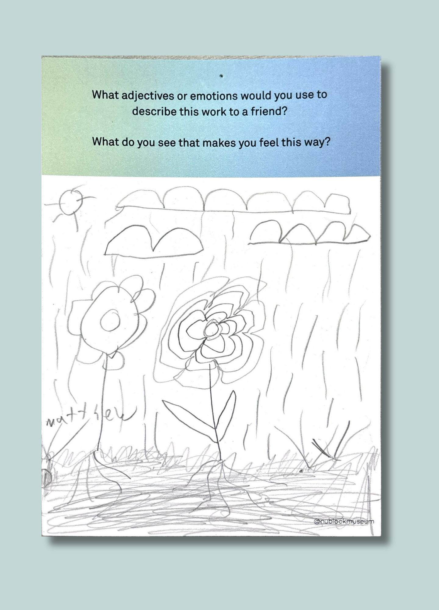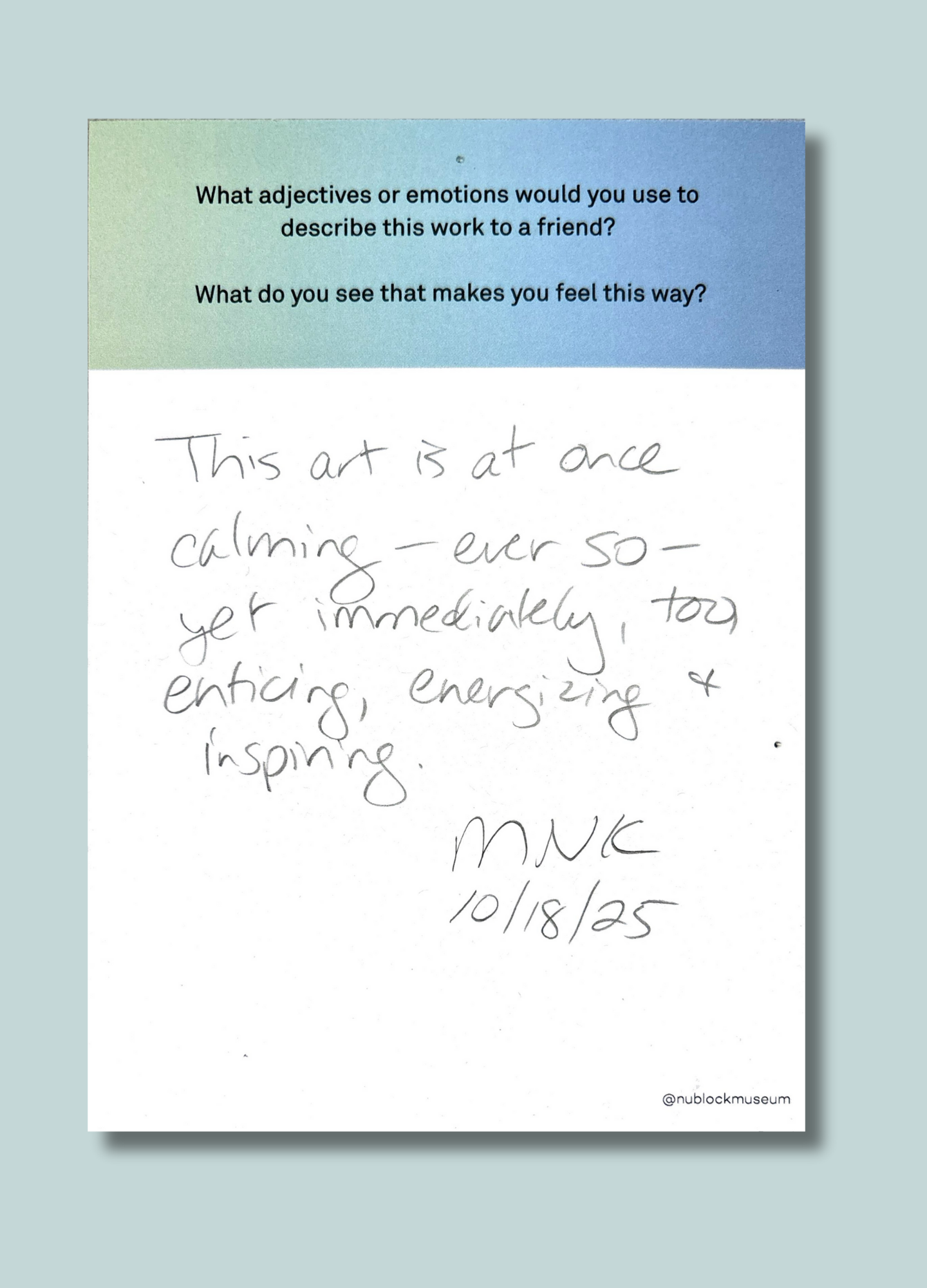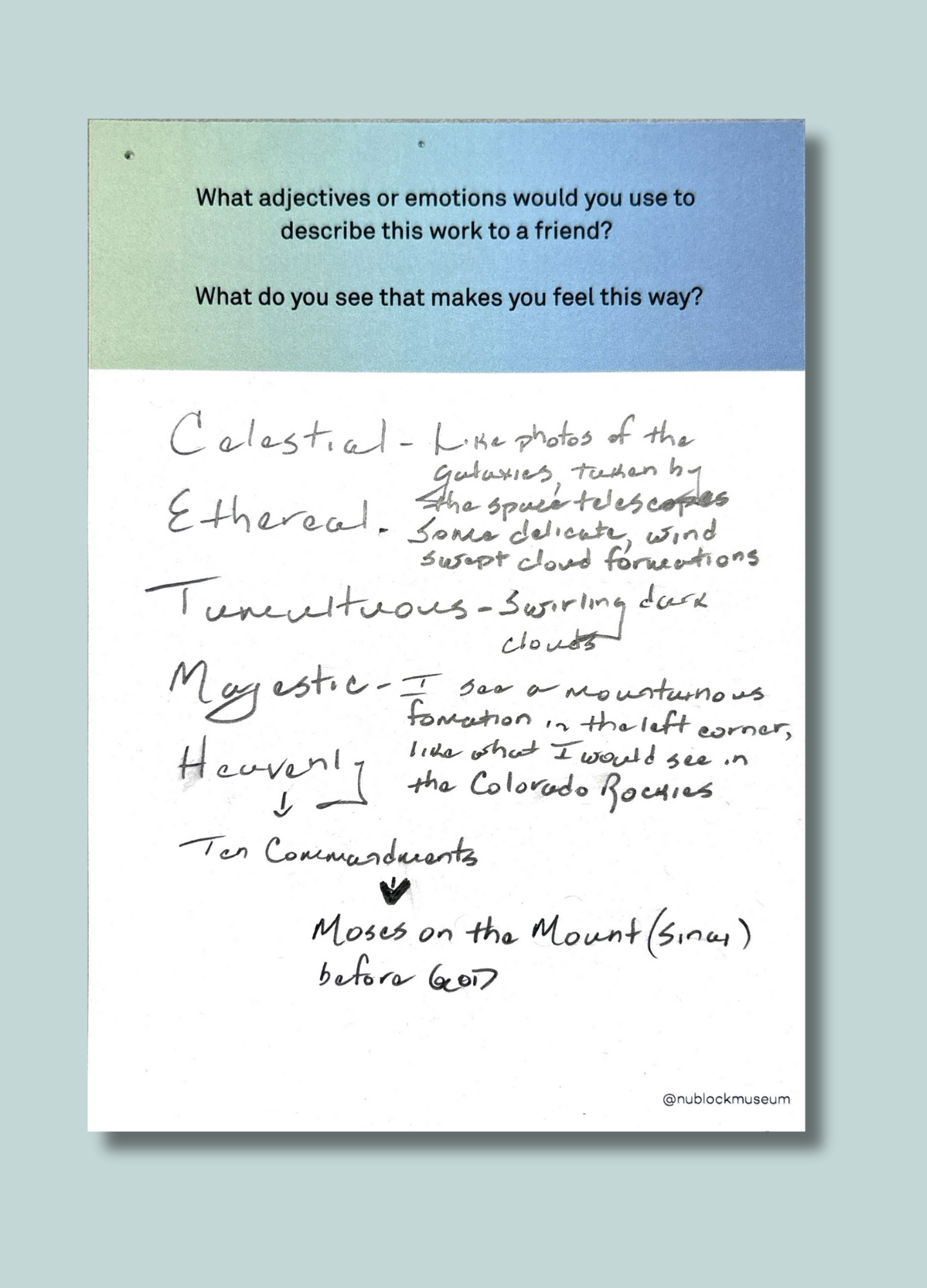 As part of The Living Room at The Block Museum, Student Associates invited visitors to respond to close-looking prompts designed to spark observation, interpretation, and conversation. These prompts encouraged participants to draw connections between what they see and what they think — on their own or in dialogue with others.