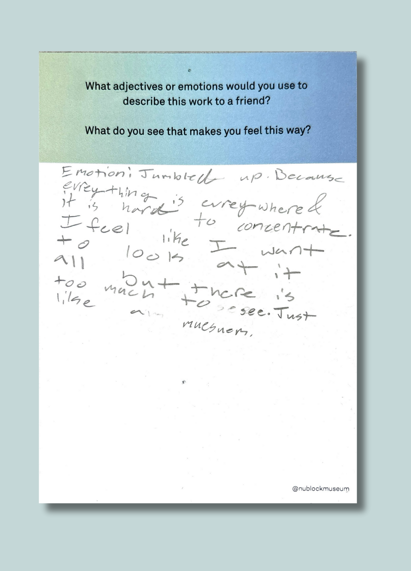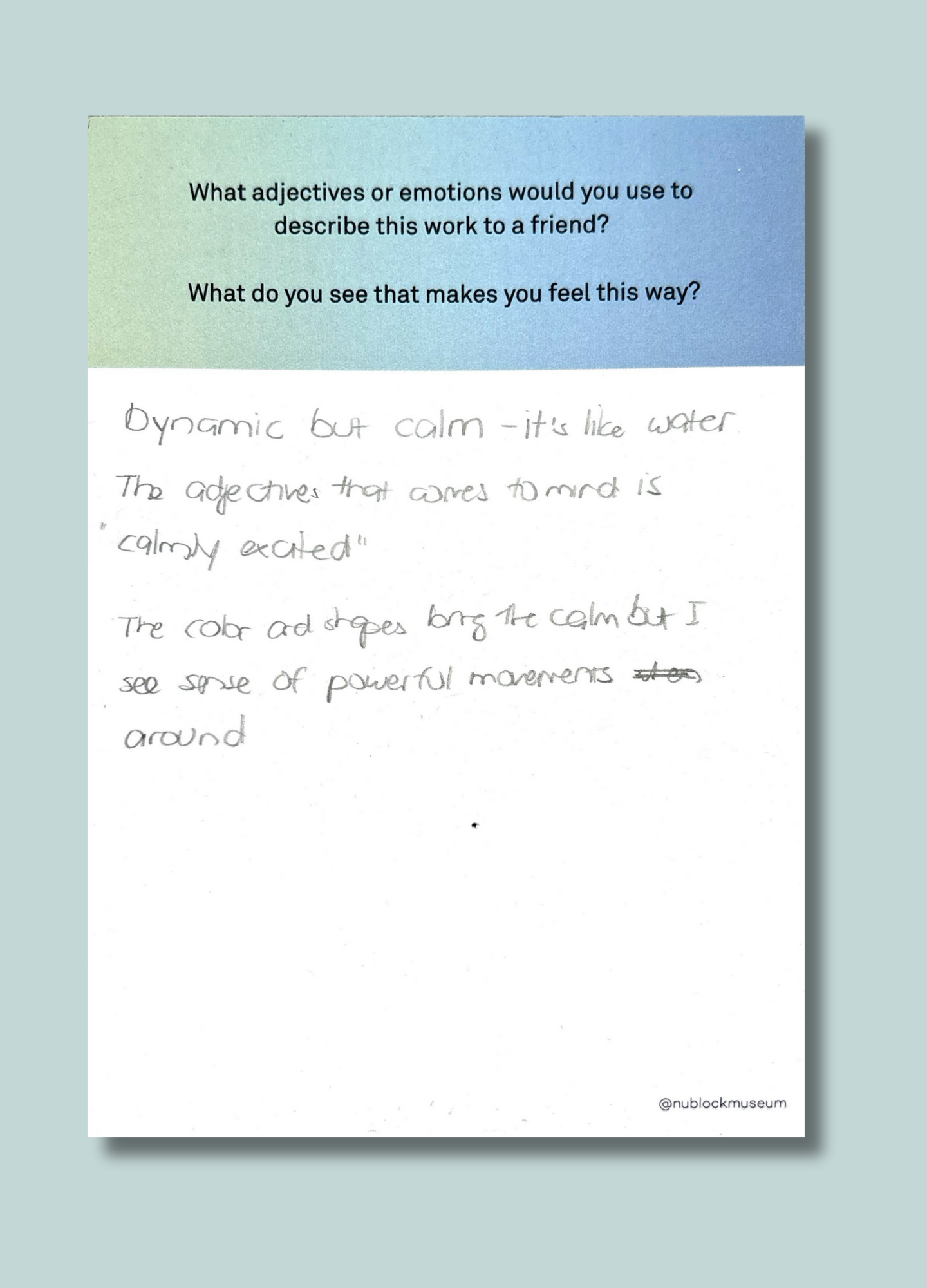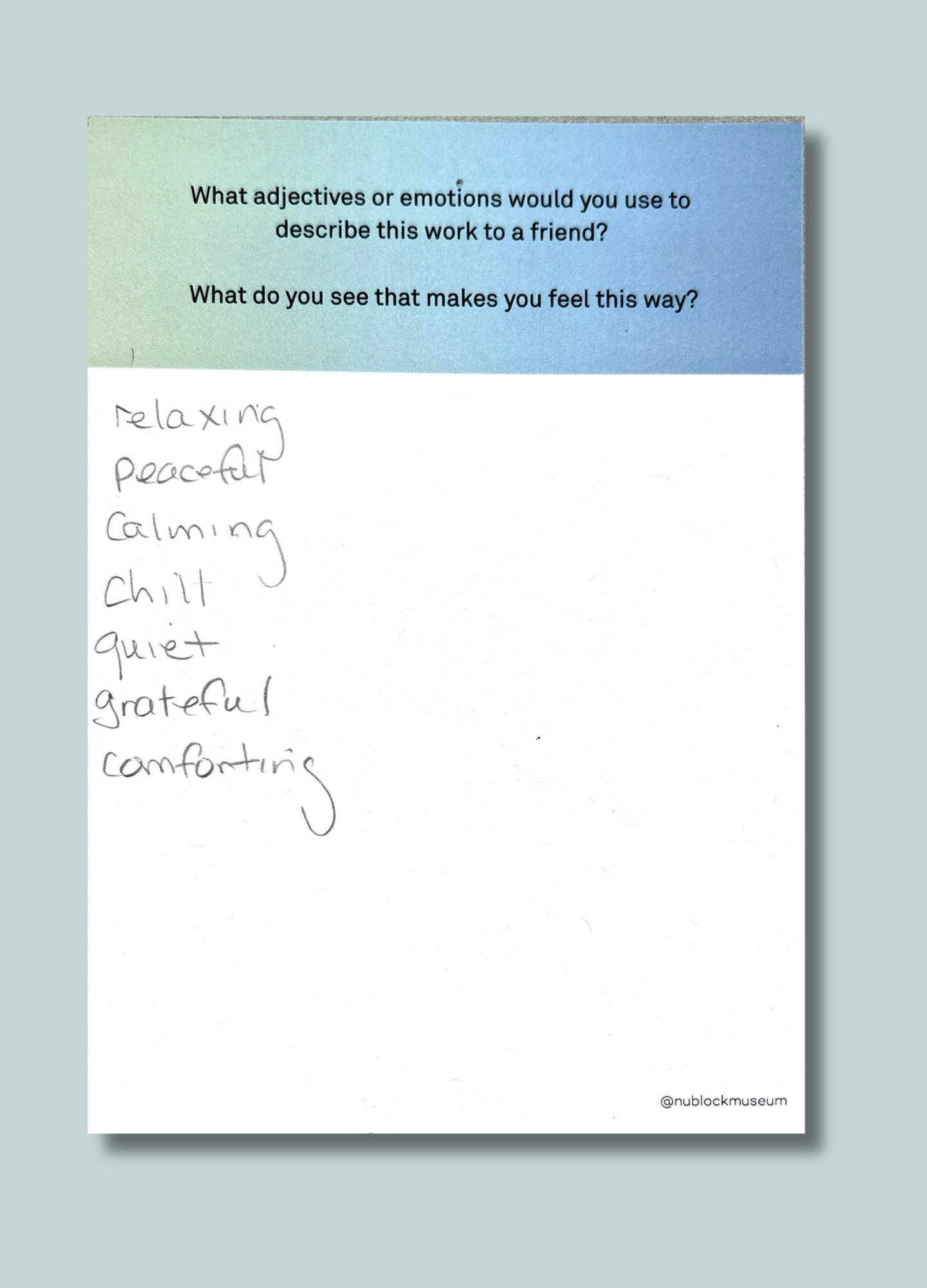 As part of The Living Room at The Block Museum, Student Associates invited visitors to respond to close-looking prompts designed to spark observation, interpretation, and conversation. These prompts encouraged participants to draw connections between what they see and what they think — on their own or in dialogue with others.